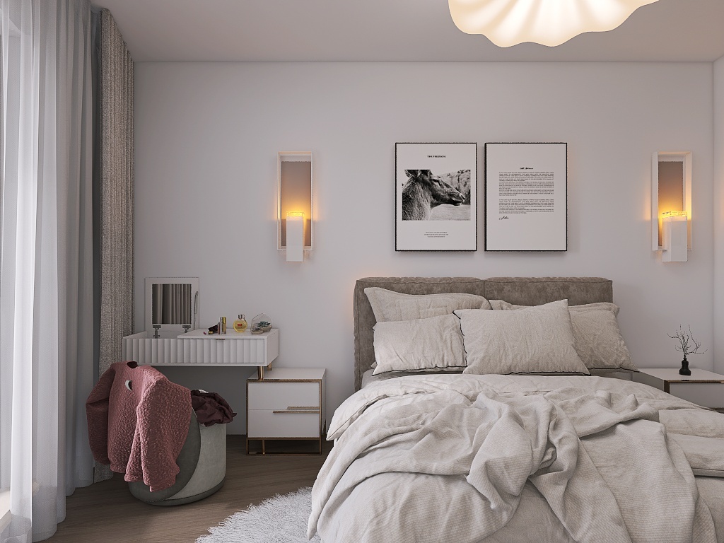- Кровать с изголовьем-вешалкой. Вместо прикроватной тумбы — изголовье с перекладиной или крючками. Можно повесить халат, пижаму или одежду на завтра.