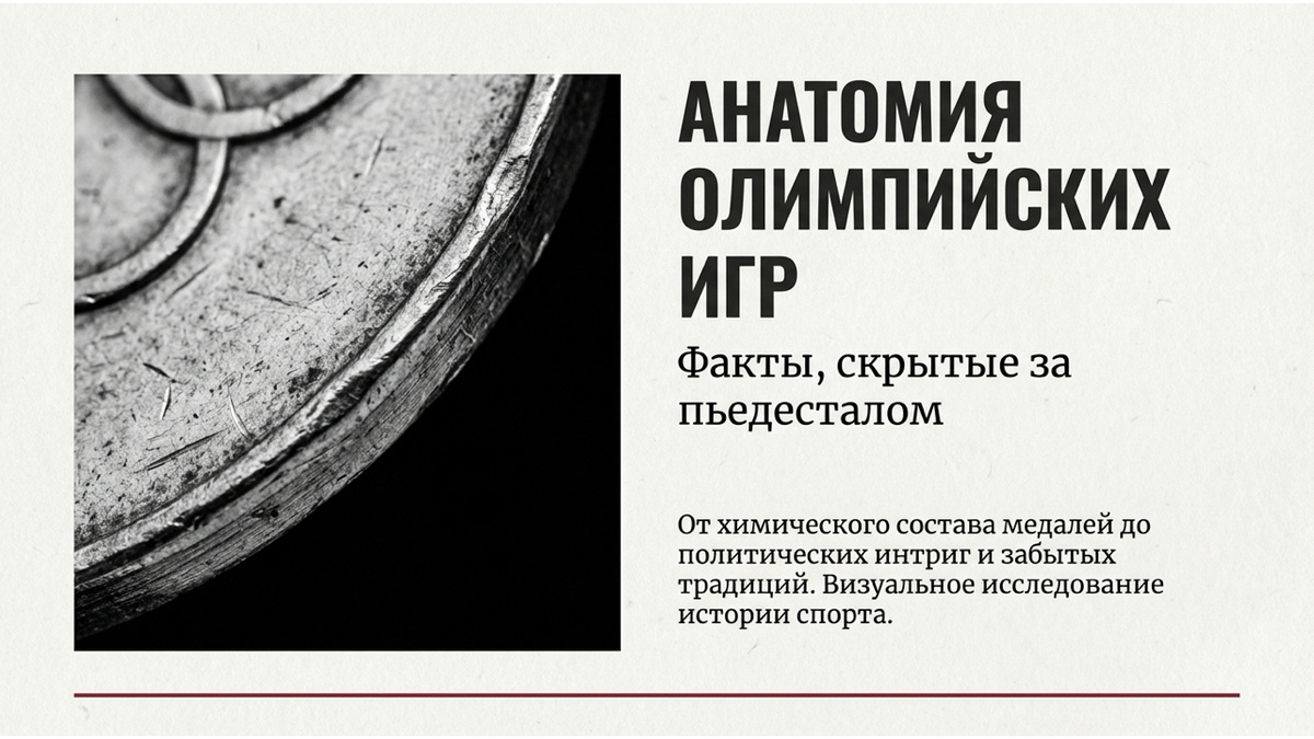 Анатомия Олимпийских игр Вводный слайд презентации, анонсирующий визуальное исследование малоизвестных фактов об Олимпиаде. Он обещает рассказать о том, что скрыто за пьедесталом: от реального химического состава медалей до политических интриг и забытых исторических традиций. Золотой миф: из чего на самом деле делают медали Современные золотые олимпийские медали — это иллюзия. На самом деле они состоят на 92,5% из серебра и имеют лишь тонкое покрытие из 6 граммов золота. Последний раз награды из цельного чистого золота вручались чемпионам более века назад, в 1912 году. Рыночная стоимость бронзы Экономика третьего места весьма прозаична. Бронзовая олимпийская медаль представляет собой простой сплав меди, олова и цинка. Если оценивать только стоимость самих материалов, то цена такой награды составит символические 140 рублей. Космическое исключение: Сочи-2014 На зимней Олимпиаде в Сочи произошел уникальный случай. 15 февраля 2014 года, в первую годовщину падения Челябинского метеорита, ч