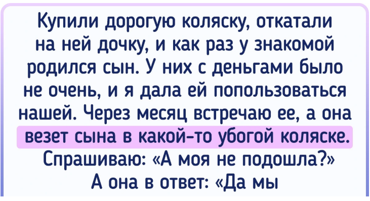 - Купили дорогую коляску, откатали на ней дочь. Когда у знакомой родился сын, я дала коляску ей временно — у них были финансовые трудности. Через месяц вижу ее с ребенком в другой, дешевой коляске. Спрашиваю, где моя. Она отвечает: «Мы продали. Цвет девчачий и не новая. А эту мама купила, новую». Я напомнила, что давала ее лишь на время. Она пожала плечами: «У вас же деньги есть». То, что я могла продать ее сама и вернуть часть средств, ее не смутило. © Юлия-Пилюлия / AdMe