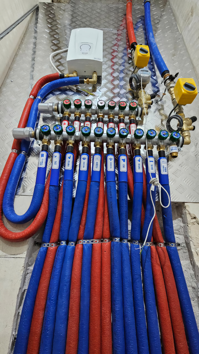 Каждая водоточка подключена к отдельному отводу коллектора, что позволяет перекрывать воду отдельно от всей системы. А также обеспечит стабильное давление воды в системе, исключит перепады и давления и температуры, при