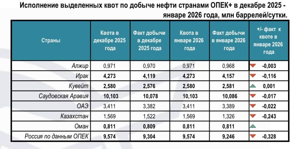 📊 Россия по итогам декабря 2025 - января 2026 года перевыполняла квоты по сокращению добычи, или не использовала возможности по наращиванию