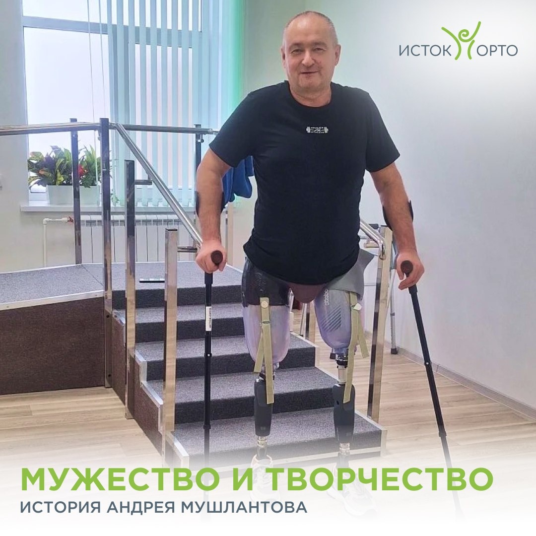 #историипациентов@istokortho ⭐️ Наш герой принимал участие в спецоперации с 9 декабря 2024 года. На службу он отправился добровольно, неоднократно проявлял мужество и самоотверженность при выполнении поставленных боевых задач. В сентябре 2025 года, выполняя задачу по прикрытию движения мотострелковых групп от БПЛА вблизи населенных пунктов ДНР, Андрей Владимирович получил тяжелые ранения, лишился обеих ног. Однако его стойкость и воля к жизни не позволили ему сломиться. В связи с проявленным героизмом и личным мужеством А. В. Мушлантов был представлен к государственной награде. ➡️ Лечение ветеран СВО проходил в госпитале в Санкт-Петербурге. В этот период большую поддержку оказала его семья: жена все время находилась рядом, приезжали навестить сыновья. 🤝 Долгий путь восстановления продолжился в нашем центре. В «Исток-Орто» Андрею Владимировичу изготовили функциональные протезы, провели курсы массажа и лечебной физкультуры, направленные на подготовку к движению на протезах. Обучение