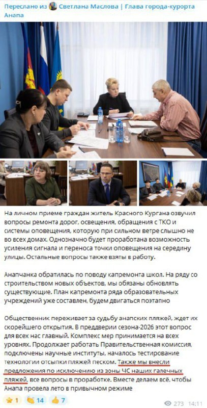 ! Как только все опубликовали слова мэра об исключении галечных пляжей из зоны ЧС в Анапе, то эта фраза исчезла из телеграм-канала главы. На первом фото - изначальный пост, на втором - уже правленный. Что происходит вообще? Светлана Борисовна передумала? 🤔