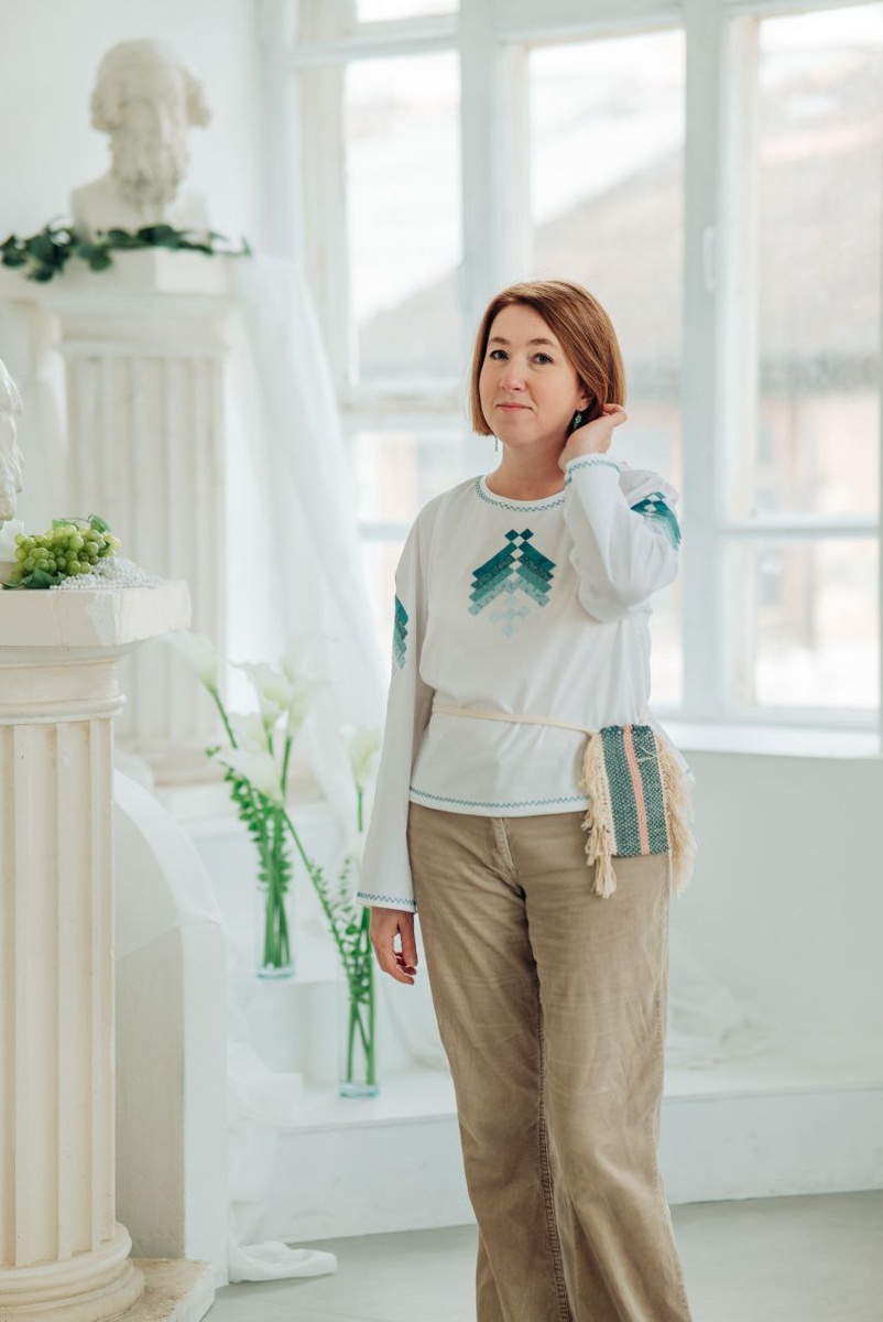 Перво-наперво мне хотелось попробовать приложить лоскутное шитьё к декору блузки. Напомню, задание было - из обычной футболки создать блузку в этническом стиле. Я выбрала символ "Алатырь" - если интересно, почитайте в интернете, сколько всего позитивного он несёт. Мне хотелось создать носибельную вещь, которую я смогу одеть с джинсами или юбкой, поэтому отказалась от использования красного цвета, как в оригинальном узоре, а использовать только форму символа. И разделила её на 4 части - для переда, спинки и рукавов, чтобы я оказалась как бы в центре символа)) Далее лоскутная сборка и пришивание готовых рисунков потайными стежками на блузу. У футболки были удалены рукава и выкроены из батиста другие - блузочные. Завершила работу швом "козлик" по горловине и низу рукавов. Как вам такой вариант "преображения" из футболки в блузку? Вы подобное делаете со своими вещами?