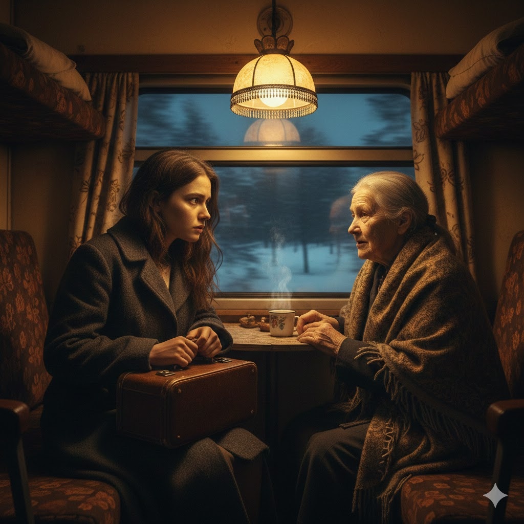 Когда подошел состав, Кристина почти запрыгнула в вагон. Внутри пахло сухими травами, пыльными занавесками и чем-то необъяснимо родным — так пахнет в доме у бабушки перед праздником. Она нашла свое купе. На нижней полке уже сидела женщина неопределенного возраста в уютном пуховом платке, наброшенном на плечи.