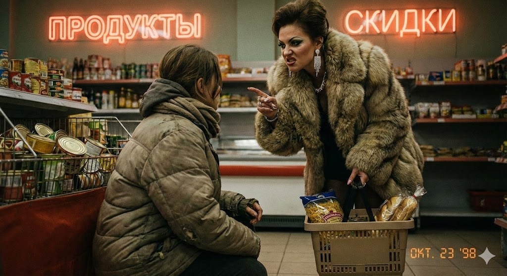 Елена присела на корточки, делая вид, что поправляет сапог, и с ужасом заметила свежую стрелку на колготках. Прямо перед ней стояла корзина с товарами по акции — её единственное спасение в эти трудные месяцы. Отвечать не хотелось. Но Жанна подступила ближе, брезгливо скользя взглядом по скромным покупкам Елены: дешёвые макароны, серый хлеб, банка копеечного паштета.