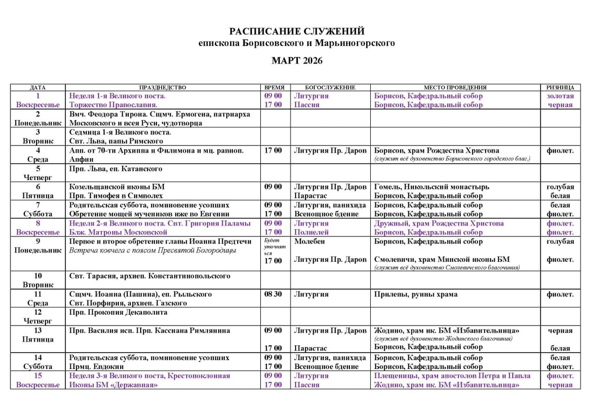 РАСПИСАНИЕ СЛУЖЕНИЙ / епископа Борисовского и Марьиногорского