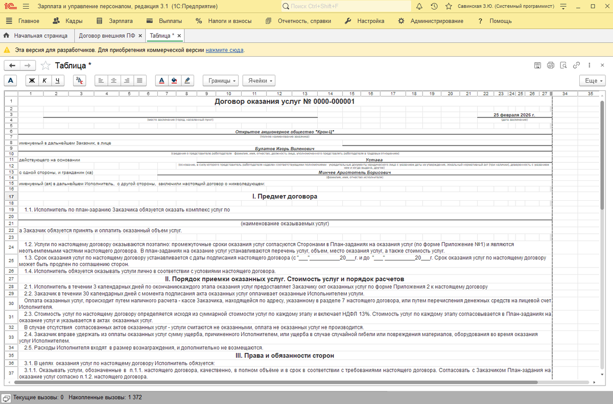 Шаблон внешней печатной формы Договора (работы, услуги) для ЗУП
