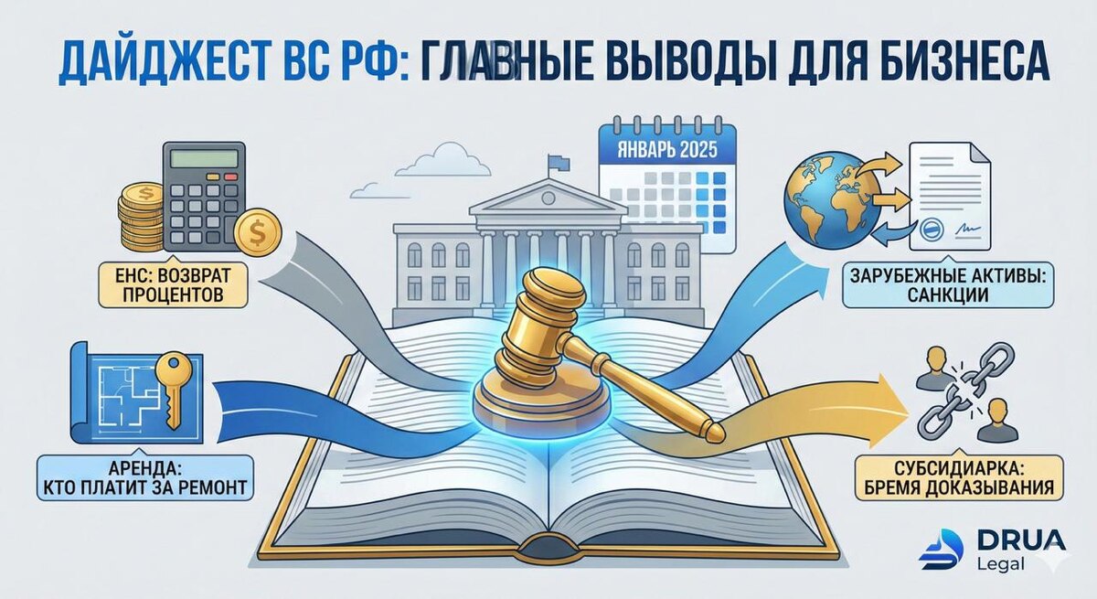 Январь – это не только оливье и попытки войти в рабочий режим, но и активная работа Экономколлегии Верховного Суда. Судьи разобрали несколько крайне важных для предпринимателей ситуаций: от проблем с ЕНС при переезде компании до вывода активов из-за рубежа. Команда DRUA Legal изучила свежую практику и выбрала то, что касается нас с вами напрямую. 👇 💸 1. Налоговая «ошиблась» с ЕНС? Пусть платит проценты! Ситуация, знакомая многим при смене юридического адреса: компания переехала в другой регион, и налоговая списала одни и те же налоги дважды (старая и новая инспекции не договорились). Ошибку признали, деньги вернули, но... без компенсации. Суды нижестоящих инстанций сказали: «Ну вернули же, чего вам еще?». Верховный Суд не согласился: Положительное сальдо ЕНС – это законная собственность налогоплательщика. Если фискалы незаконно изъяли оборотные средства (даже по технической ошибке), они обязаны заплатить проценты за пользование чужими денежными средствами. 👉 Мораль: Не бойтесь т