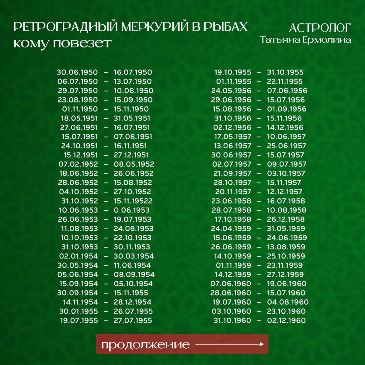Везет же некоторым! Немного завидуя счастью тех, кто нашел себя на слайдах выше, сообщаю, что ретроградный Меркурий (с 206 февраля по 20 марта) обязуется не чинить вам препятствий и всячески помогать в ваших планах по мере его скромных сил))) Если вы нашли своих близких или друзей в этих периодах, то рекомендую март провести под их счастливой аурой, ведь иногда счастье нашего окружения - это наше счастье. Что стоит делать тем, кто нашел себя в списке: • возобновлять старые дела и обучение • разговаривать начистоту и прояснять все до последней запятой • не бояться говорить честно браться за самые сложные задачи из прошлого • навести порядок в своей жизни Конечно, при сборе этих данных рождения я не смогла учесть нюансы конкретно взятой карты. Это в силах сделать только персональный прогноз. Вы можете его получить сегодня. Прием заявок на прогноз скоро завершается! Переходите за расчетом прогноза СЮДА 👉ПОДПИШИТЕСЬ НА КАНАЛ! ЗДЕСЬ ВЫ НАЙДЕТЕ САМЫЕ СВЕЖИЕ ПРОГНОЗЫ ПО ЗНАКАМ И НА АСТРОЛОГ
