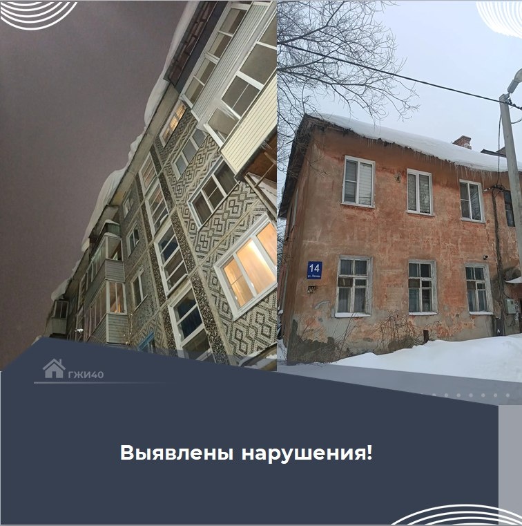 части ненадлежащего содержания крыш (наледь, снежные навесы), а также был осуществлен мониторинг соседних домов: г. Калуга, ул. Пухова, д.5 г. Калуга, ул. Лесная, д.14 в УК направлены требования на устранения нарушений. Усилен контроль за УК, как поручил Владислав Шапша.
