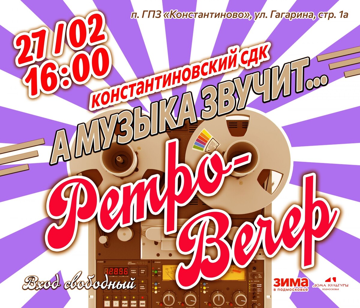 ✨ 🎉💃 Приглашаем вас на танцевальный ретро-вечер! 🕺✨ Погрузитесь в атмосферу золотых времён! Только самые лучшие и зажигательные ретро хиты, которые заставят вас танцевать до упада! 🎶❤ Не упустите возможность провести вечер в отличной компании и зарядиться позитивом! 🌟 🚫 Возраст: 18+ 📆 27.02.2026🕒16:00 🏢 Константиновский сельский дом культуры (СДК) 📍 г.о.Домодедово, пос.Государственного племенного завода Константиново, ул.Гагарина, д.1А ✅ Мероприятия Домодедово https://dzen.ru/id/66f10385cc4c5a16f7b5fb02 http://vk.com/domodedovo_events http://dzen.ru/domodedovo_events