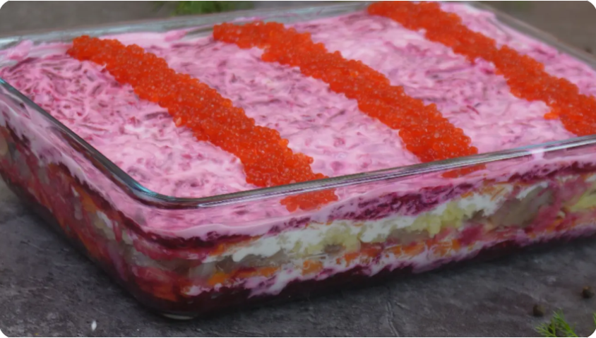 Этот рецепт — замечательный пример того, как небольшое изменение в привычной технологии может подарить новые ощущения от знакомого блюда. Слои здесь расположены так, что свекла не окрашивает сразу все продукты, а вкус получается более многослойным и интересным.