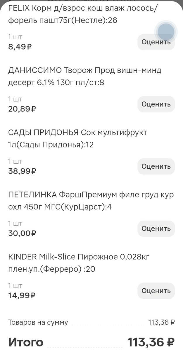 Всё купила по купонам со скидкой из игры и списала бонусы. Фарш со скидкой 70%, сок, Феликс, молочный ломтик - 50%, Даниссимо 30%.