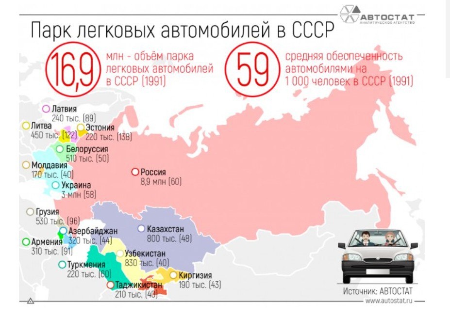 Данные по числу машин на 1000 человек в каждой республике в позднем СССР