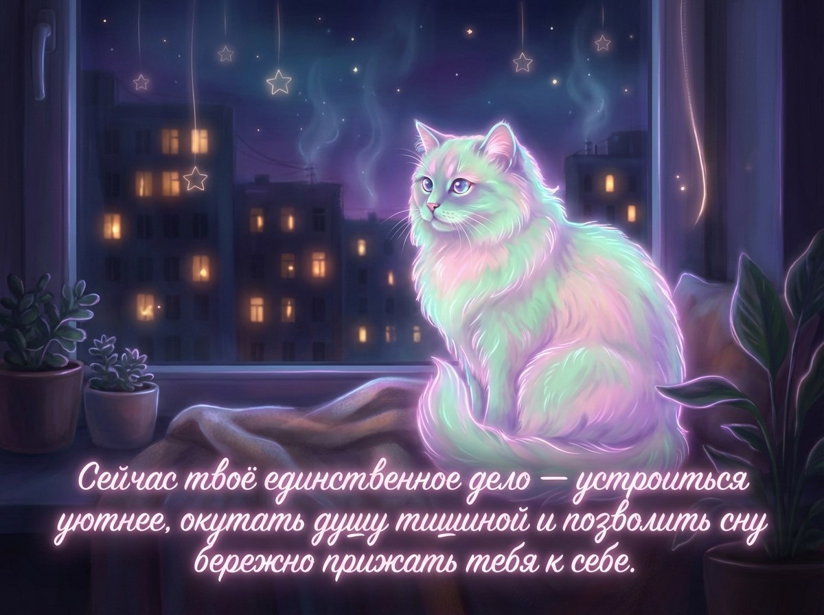 Снаружи мир темнеет, как мягкий бархат, а в окнах зажигаются тёплые огни. Позволь себе выдохнуть весь прожитый день, как будто выпускаешь в небо россыпь звёзд, и каждая звезда шепчет: «Ты сделал(а) достаточно, ты имеешь право на покой». Посмотри на меня: я смело шагаю по темноте, потому что доверяю её мягкости. Так и ты можешь довериться этой ночи. Всё важное не исчезнет до утра, а тревоги могут раствориться, как туман над рекой. Сейчас твоё единственное дело — устроиться уютнее, окутать душу тишиной и позволить сну бережно прижать тебя к себе. Ты в безопасности, тебе можно отдыхать, а завтра я снова приду на шёлестящий свет нового дня вместе с тобой.