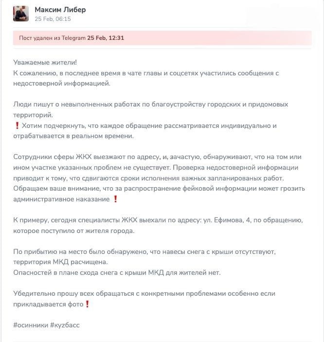 Глава Осинников Максим Либер заявил, что проблемы жителей часто не подтверждаются. В пример он привел дом, жильцы которого сообщали о снеге на крыше и тротуарах — по версии мэра, на месте все оказалось чисто. Хотя на фото, которое он сам приложил, снег на крыше видно. Либер и администрация в своих постах также напомнили об ответственности за распространение фейков. Люди остались в замешательстве: они жаловались еще в начале месяца, потом потеплело и глыбы попадали сами. Администрация рапортовала о чистке 16 февраля, но жильцы это опровергают. Скандальный пост мэр позже удалил. ⭕️ Подписаться | Мы в MAX | Буст