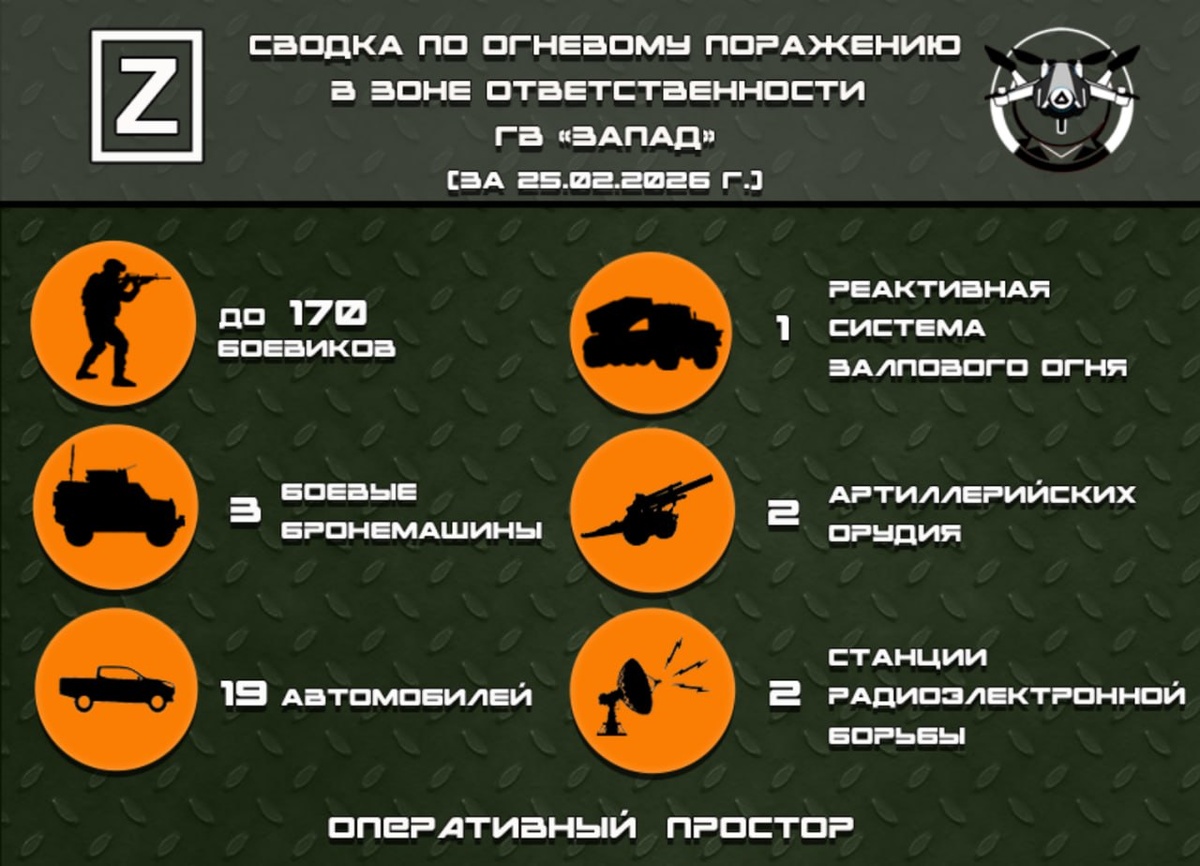 Сводка по огневому поражению в зоне ответственности ГВ «Запад» за 25.02.2026 г