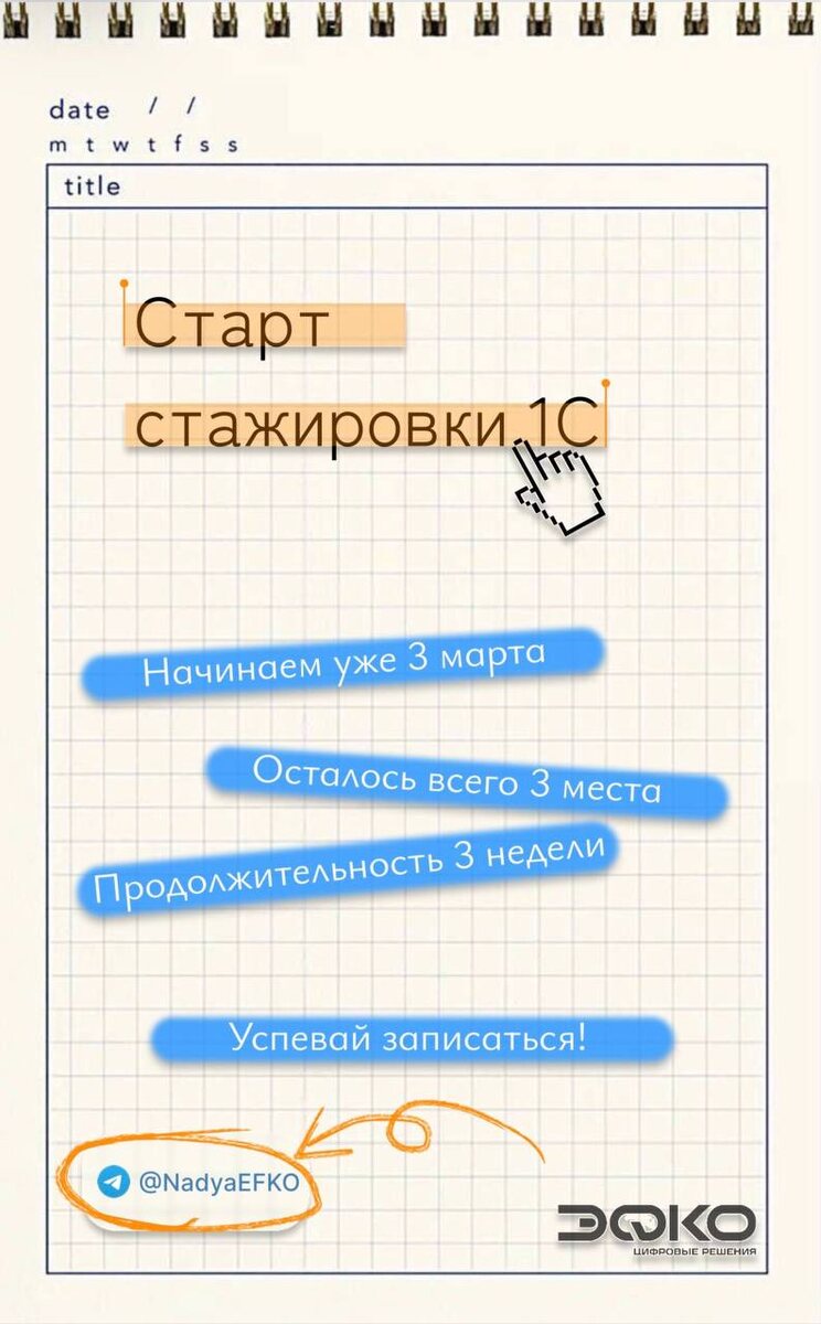 !🥳 И запустим стажировку по 1С, где полностью изучите платформу и научитесь работать с конфигурациями👨💻👩💻 Стажировка бесплатная Записывайтесь по контактам: @NadyaEFKO