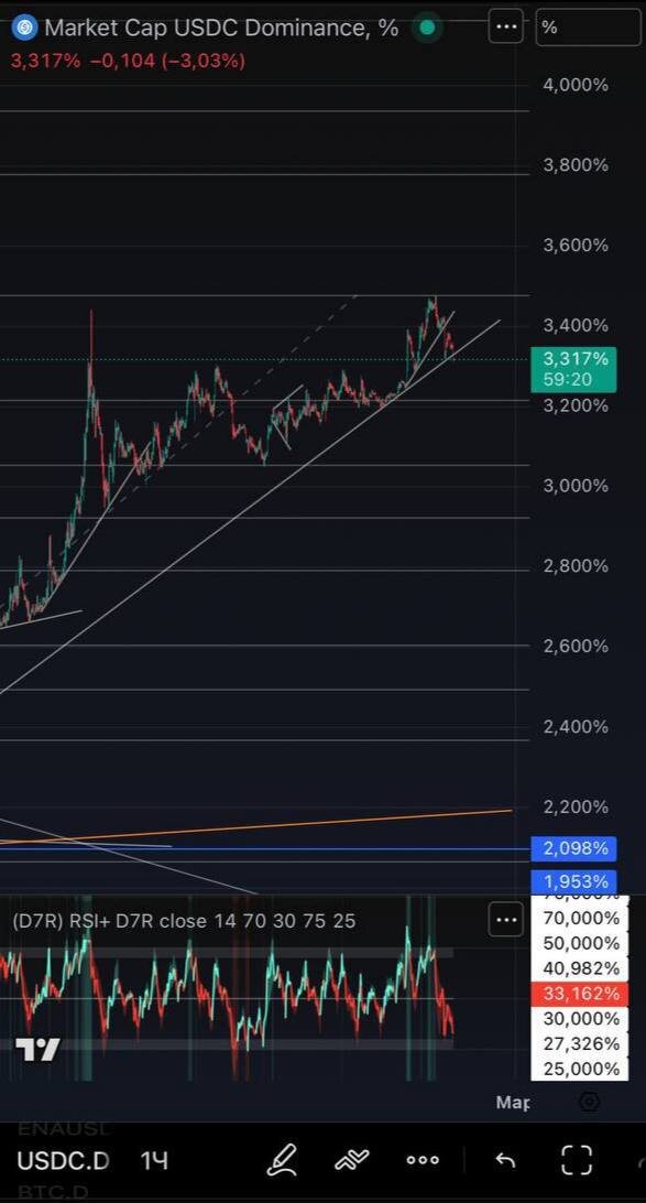 На #usdc.d сформирован пробой в шорт, еси доминация у стейблов падает, значит трейдеры, откупают крипту, если же растет то крипту продают.