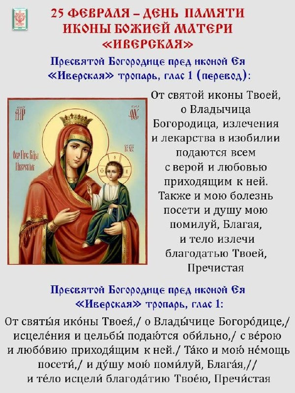 В IX в. образ хранился у благочестивой вдовы. Иконоборец ударил икону копьем, целясь в лик Божией Матери. Из раны потекла кровь. Вдова спасла икону от уничтожения, опустив в море. Образ пришел у берегу Святой Горы Афон. От него к небу исходил огненный столп. В Иверском монастыре жил старец Гавриил, ему во сне явилась Пресвятая Дева: «Скажи настоятелю с братией, что Я хочу дать им Свою икону, покров Свой и помощь; потом же ступай в море - иди с верою прямо по волнам, и тогда узнают все Мою любовь и благоволение к обители вашей». Святогорцы 3-е суток молились перед иконой, затем отнесли ее в алтарь соборного храма, но икона трижды появлялась над монастырскими вратами. Тогда был построен надвратный храм, в котором икона находится и сегодня, ее второе название – «Вратарница». Икона никогда не покидала монастырь Иверон, но ее списки есть во многих православных храмах по всему миру. В Москву список иконы был принесен в 1648 г. Иверский образ Богородицы явил множество чудес.