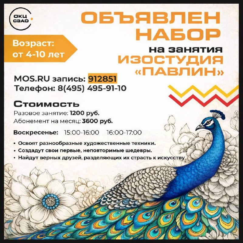 » 🦚 Ваш ребенок, то и дело берет в руки краски и разрисовывает все вокруг?) Приводите его к нам! Приглашаем детей 4–10 лет на занятия по изобразительному искусству. 🖼ЧТО ЖДЕТ БУДУЩЕГО ХУДОЖНИКА? 〽️Разнообразные художественные техники 〽️Живопись, графика, композиция 〽️Развитие воображения и вкуса 〽️Новые друзья и творческая атмосфера 📆Расписание: Воскресенье: 🕒 15:00–16:00 🕓 16:00–17:00 Стоимость: 💳Разовое занятие — 1200 руб. 💳Абонемент на месяц — 3600 руб. ❕Запись через mos.ru 📞 8 (495) 495-91-10 Ждем вас по адресу: ул. Вилиса Лациса, д.11, к.3 Количество мест ограничено. #изостудия #павлин #детитворят #рисованиедетям #творчество #детимосква #допобразование #набордетей #окцсзао 📱 Подписывайся на наш канал, чтобы не пропустить интересные мероприятия в СЗАО!