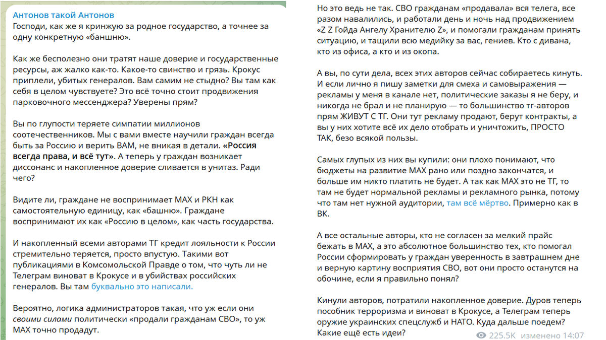 Честно, не знаю, чем Алексей Антонов занимался в феврале-марте 2022 года (когда для инфопространства России было самое опасное время и, как он правильно говорит, официальные площадки не справились с задачей и просто молчали), но лично я не припоминаю, чтобы он был тогда со своим ТГ-каналом хоть как-то заметен в этот самый период на информационных фронтах.