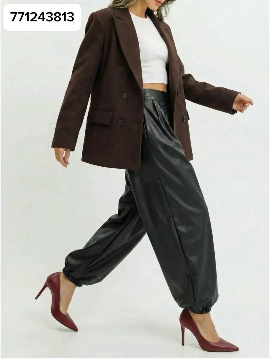Эта модель — смелый акцент гардероба. Брюки свободного силуэта с объёмом в области бёдер и мягкой сборкой у щиколотки создают выразительную форму. Экокожа придаёт образу современность, а чёрный цвет добавляет универсальности.