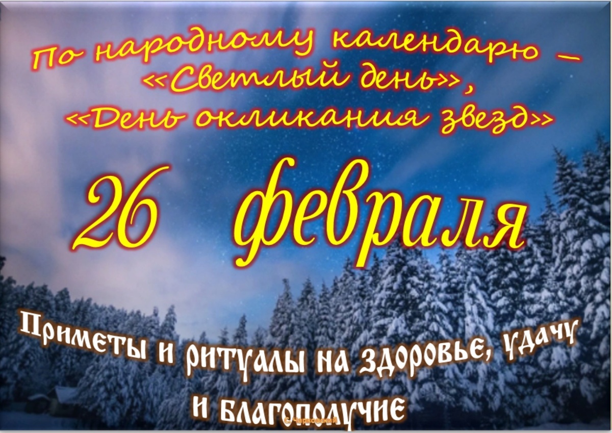 Сегодняшний день это «День улучшения зрения». 26 февраля было принято проводить специальные ритуалы, помогающие улучшить зрение. Плохо видящий должен был выйти на улицу ровно в полночь, протянуть руки к звездам и попросить, чтобы они стали светить для него ярче. Потом он, в соответствии с ритуалом, утирал глаза и уходил, не оглядываясь»: