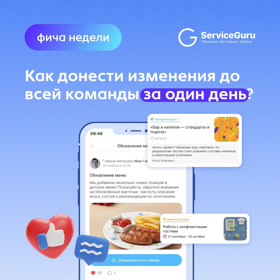 ? 📣 В развивающемся бизнесе изменения происходят постоянно: обновилось меню, изменился график работы или вводятся новые стандарты и правила. В потоке информационного шума и хаоса в чатах легко потерять важные новости. Но проблема не только в беспорядке — отсутствие единого канала связи критически замедляет внедрение любых решений и лишает команду гибкости. Пока новость дойдет до каждого, бизнес теряет деньги. 💡С Лентой новостей и push-уведомлениями в ServiceGuru вся важная информация гарантированно и вовремя доходит до каждого сотрудника. Как это работает? ✔️ Вы публикуете новость один раз, и она сразу появляется в смартфонах у всей команды. Или создаете отложенную новость, которая автоматически отправится в нужный момент. ✔️ Сотрудники получают мгновенные push-уведомления не только о важных новостях, но и о любых обновлениях: от запуска нового курса до добавления блюда или материала в библиотеку. Даже те, кто сегодня на выходном, придут на смену уже подготовленными. ✔️ Контроль
