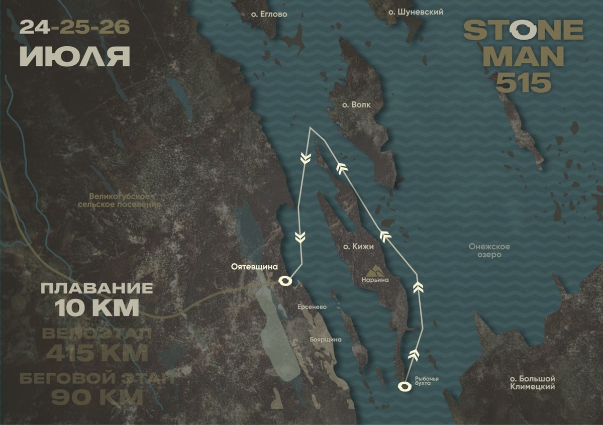 Ультратриатлонов в России станет в этом году больше. С 24 по 26 июля 2026 года в Республике Карелия состоится STONEMAN! Что такое ультратриатлон STONEMAN? Классический формат ультратриатлонов: • 10 км плавания в Онежском озере (старт с острова Кижи!); • 415 км велотрассы за 2 дня; • 90 км бега с финишем в столице Карелии городе Петрозаводске. Плавательный этап в Кижских шхерах, линейная дистанция со стартом на острове-музее. Тут часто проводят заплывы. Температура воды, как и воздуха, в Карелии бывает очень разной. Ориентировочно 17-22 градуса. Велоэтап разделен на 2 дня (первый день - 150 км, второй - 265 км, в сумме 415 км с машиной сопровождения). Беговой этап это 90 километров, которые начинаются с невероятно живописных грунтовых и лесных дорог Карелии. Ближе к финишу участников ждет асфальтированная дорога. STONEMAN 515 — детище двух увлеченных триатлетов и опытных организаторов. Леонов Евгений пришел в триатлон из любительского плавания, предпочитает олимпийскую дистанцию и