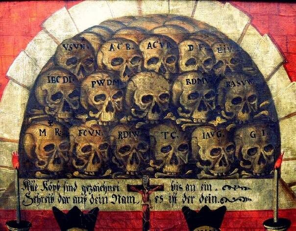 Картина Memento mori с надписью: "Все черепа подписаны, но только один - нет. Напиши же на нем свое имя, ибо он - твой".