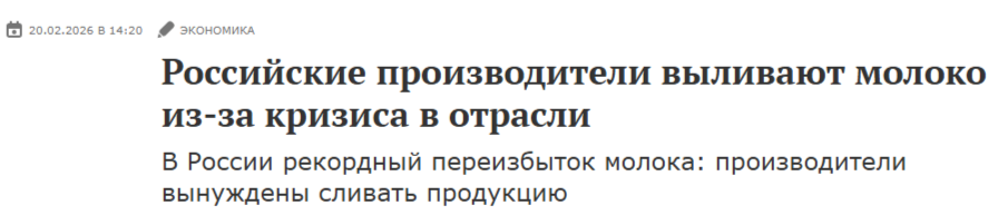 Российские производители сырого молока столкнулись с беспрецедентным затовариванием складов. Объемы производства сильно превысили возможности переработки на фоне ослабления потребительского спроса на готовую молочную продукцию. В результате компании-производители вынуждены просто выливать уже произведенное молоко! Ситуацию подтвердили федеральным СМИ представители самых разных предприятий отрасли - как мелких, так из крупных. Региональные СМИ даже приводят видео, где струя молока просто бьет в снег под напором из огромного моловокоза беспрерывно целый час (видео, конечно, короче, но суть ясна). Только на одном предприятии Свердловской области недавно слили 26 тонн молока! Цитирую: В баках находилось 26 тонн сырья. Струя молока лилась бесперебойно целый час. Видео опубликовал «Новый день». По данным журналистов, фермеры таким образом решили показать, что местные заводы перестали покупать их сырье и берут дешевый порошок из Китая и Белоруссии. Согласно данным Росстата, по итогам 2025 год