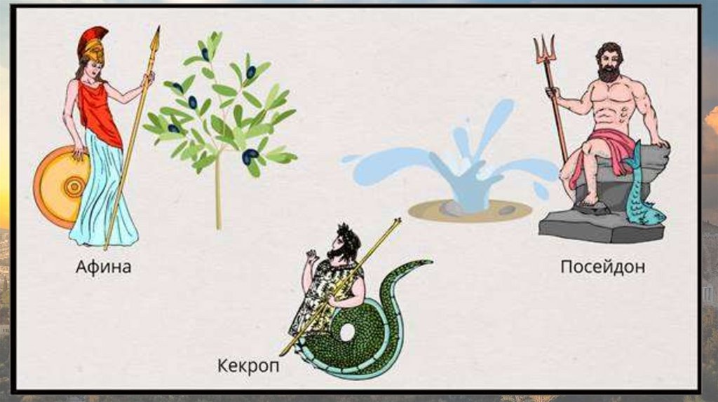 Кекроп обратился к Зевсу с просьбой определить, кто из богов достоин стать защитником нового полиса. Верховный бог повелел богам явиться в Аттику и представить свои дары. Победителя должны были выбрать: