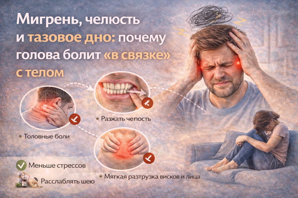 Болит полголовы. Свет раздражает. Таблетка помогает на час, потом всё возвращается. И в какой-то момент появляется мысль: «Наверное, у меня мозг сломан». А дальше начинается самое интересное: иногда причина не в «мозге», а в привычном телесном сценарии – напрячься целиком. Головные боли бывают разными, и по одному тексту диагноз не ставят. Но у многих людей с сидячей работой и постоянным стрессом есть типичный паттерн: зажим челюсти + напряжение шеи + «вечно собранное» тазовое дно. Получается странная цепочка, где верх и низ тела действительно живут в одной системе. Как это может выглядеть по зонам