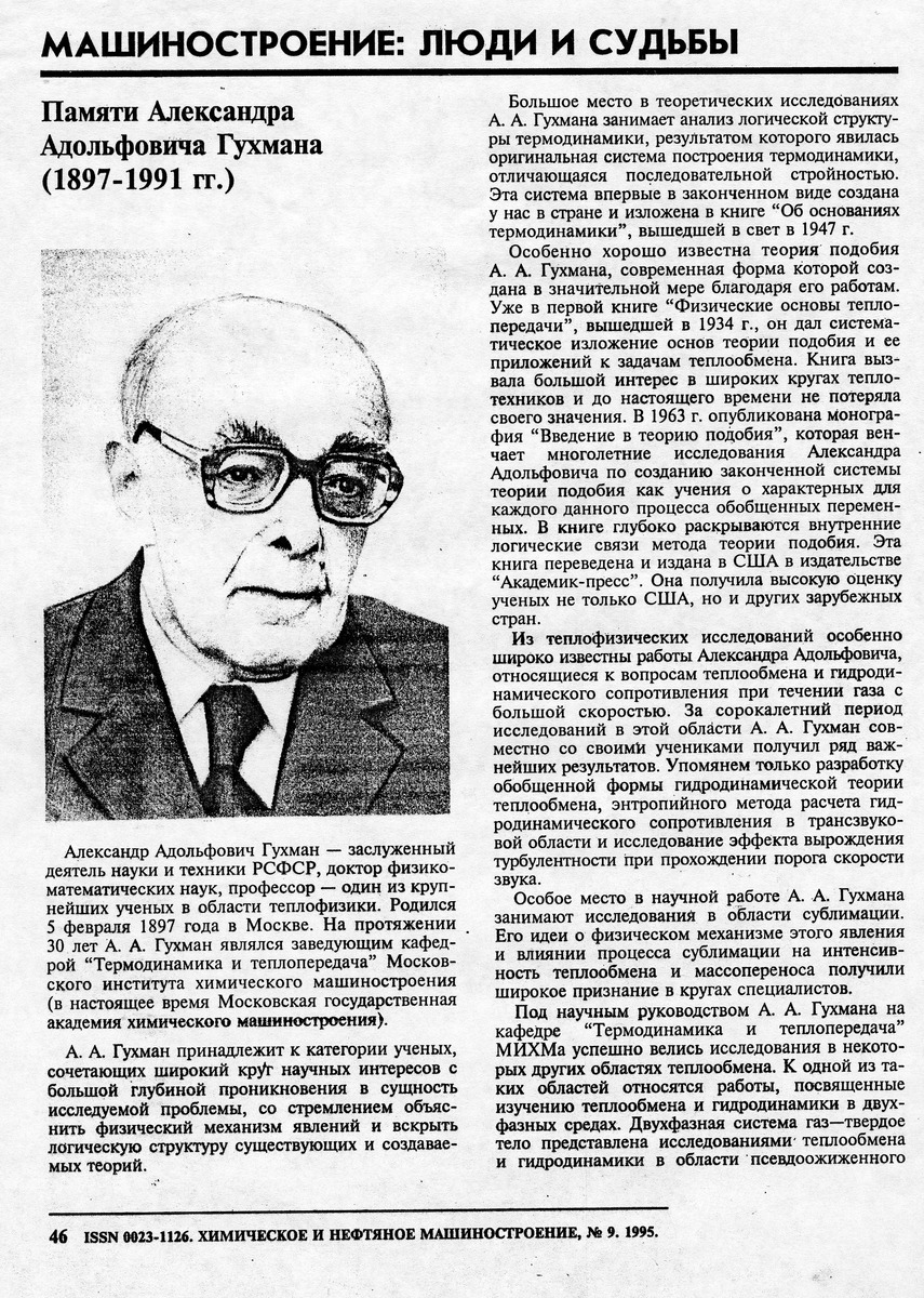Александр Адольфович Гухман — заслуженный деятель науки и техники РСФСР ,доктор физико-математических наук, профессор — один из крупнейших ученых в области теплофизики . Родился 5 февраля 1897 года в Москве . На протяжении 30 лет А. А. Гухман являлся заведующим кафедрой "Термодинамика и теплопередача" Московского института химического машиностроения (в настоящее время Московская государственная академия химического машиностроения).