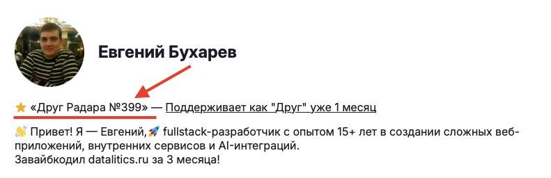 ! Только что выдали 399-й значок «Друг Радара» за поддержку нашей площадки рублем 🧭🏅 Кто станет 400-м Другом? 👀 P.S. Кто успеет, тот и станет 🚀 UPD: У нас есть 400-й друг, сделаем о нем пост в ближайшее время!