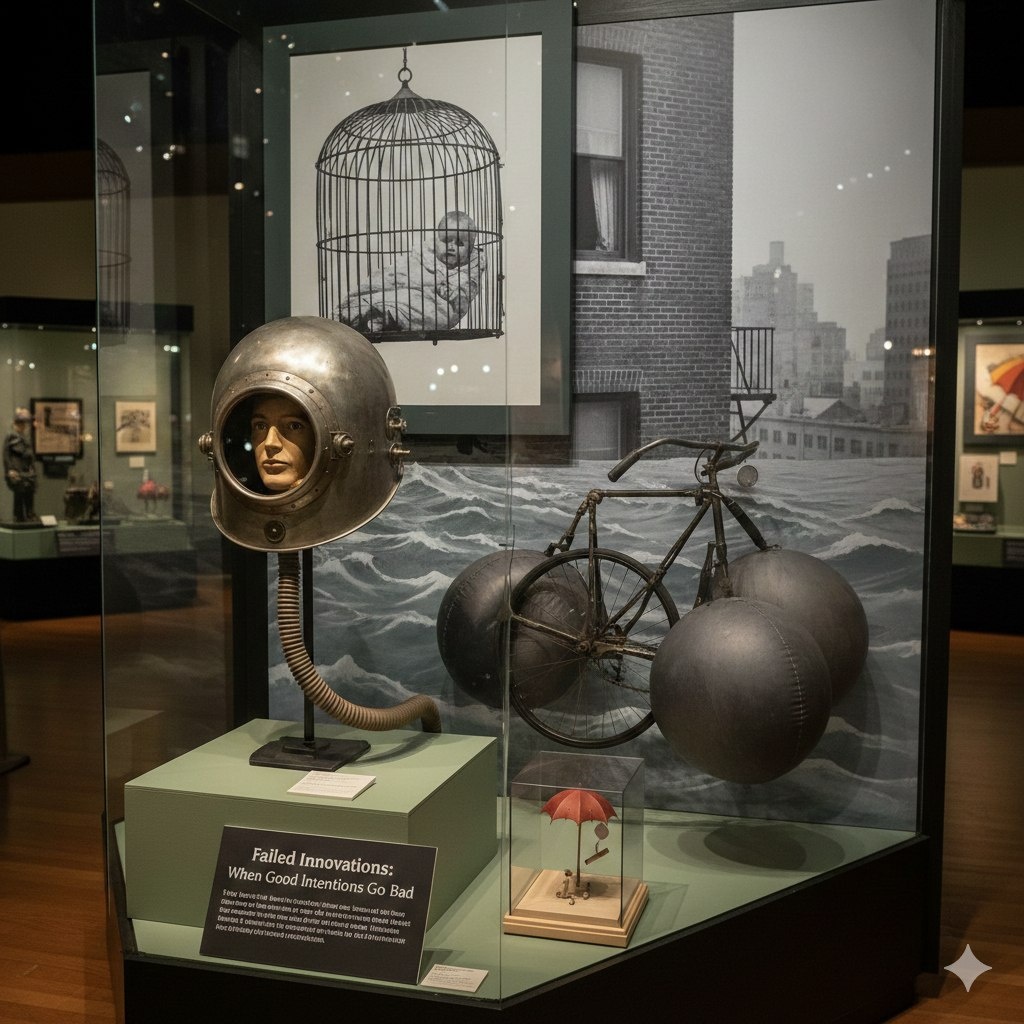» 📉🎩🛠 Иногда грань между гениальностью и безумием стирается настолько, что на свет появляются вещи, которые сегодня вызывают лишь нервный смех. 📉🤯 Гаджеты, которые не прижились 🔍📜 Шлем-изолятор. В 1925 году изобретатель Хьюго Гернсбек представил шлем, который должен был помочь писателям сосредоточиться. Огромный железный колпак полностью отсекал звуки, а воздух подавался через шланг из баллона. Выглядело это так, будто автор собирается не роман писать, а чинить реактор на дне океана. 🤿📚 Окно для прогулок. В 1930-х годах в Лондоне были популярны клетки для младенцев, которые крепились снаружи окна многоэтажек. Считалось, что городскому ребенку нужен свежий воздух, даже если он висит в сетке на высоте десятого этажа над оживленной улицей. Мамы были спокойны, а прохожие внизу — не очень. 👶🏙 Велосипед-амфибия. Попытки создать гибрид велосипеда и лодки привели к появлению монстров с огромными поплавками вместо колес. Изобретение отлично работало на чертежах, но на практ