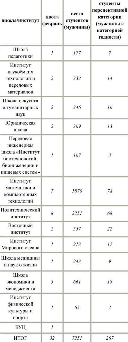 Так, Дальневосточный федеральный университет должен отправить на 32 человека только за февраль, рассказала экс-советница ректора вуза Марина Баринова. Она опубликовала таблицу, в которой показан план по контрактникам и количество годных студентов. ИнфоСплетник ────────── ⚡️Важные новости – без лишнего шума!⚡️ Подпишись на канал и получай только суть: оперативно, чётко, по делу! 👉 ИнфоСплетник | @infospletnik