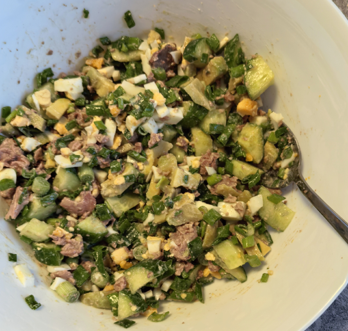 В миске аккуратно смешать печень трески, авокадо, огурец и нарезанные яйца.