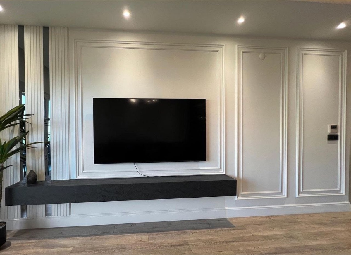 Возвращаясь к теме материалов,наткнулся на канале производителя из Южной Кореи,мне,как говорит молодежь-зашло. ◽️ Белые интерьеры — тренд последних лет, однако нередко именно белоснежные пространства выглядят излишне холодными, безликими и даже стерильными. Но, как показывает практика, используя правильные приемы, можно избежать этого эффекта и создать роскошный и стильный дизайн. Белая гостиная вовсе не означает отсутствие характера и выразительности. Например, белая стена с четкими геометрическими элементами молдинга и панелями от бренда HIWOOD воспринимается скорее как холст художника, подчеркивая красоту остальных деталей интерьера. Именно поэтому,на мой взгляд,в проекте особое значение имеет использование белого цвета в качестве фона, который подчеркивает чистоту линий и формирует ощущение пространства. Для придания объема и характера используются графитовые акценты: строгая черта линии телевизора, элегантная и лаконичная "парящая" тумба,вертикальные линии вставок из черного с