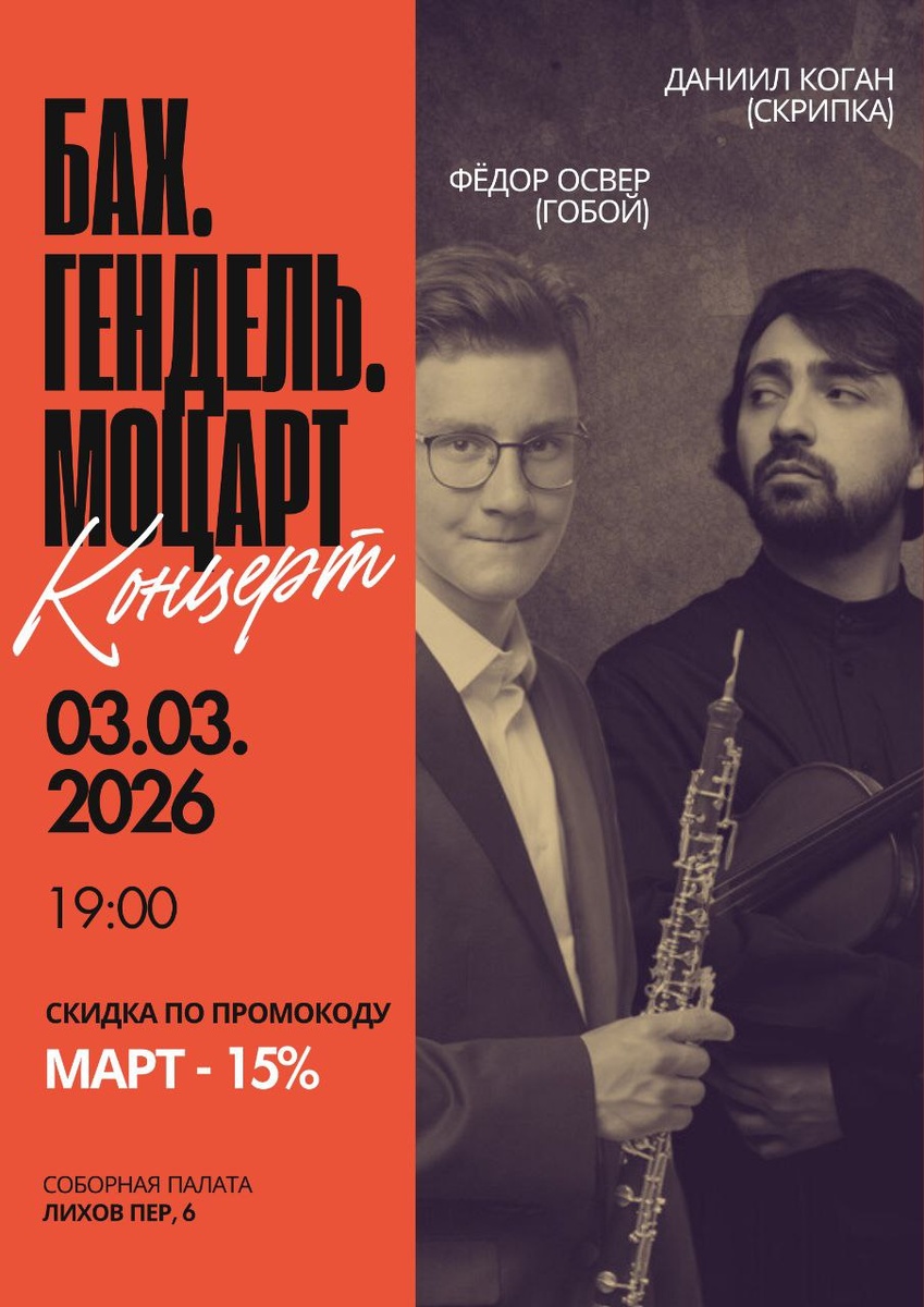 ❤️ 🎶МОЦАРТ. БАХ. ГЕНДЕЛЬ Гениальная музыка чтобы душа пробудилась для сострадания радости и любви этой весной🌷 🗓3 марта, 19:00, Соборная палата 🔺Камерный оркестр CAMERATA KOMITAS, дирижер – Эрнест АЛАВЕРДЯН 🔻Солисты – лауреаты конкурса Чайковского Даниил КОГАН (скрипка) и Фёдор ОСВЕР (гобой) ✨ ❗️❗️❗️Для вас скидка по промокоду ОРКЕСТР - 10% 📍Историческое место. Великая музыка. Великолепное исполнение. 📌Билеты здесь: www.lihov6.ru/koncerty/bakh-gendel-mocart/
