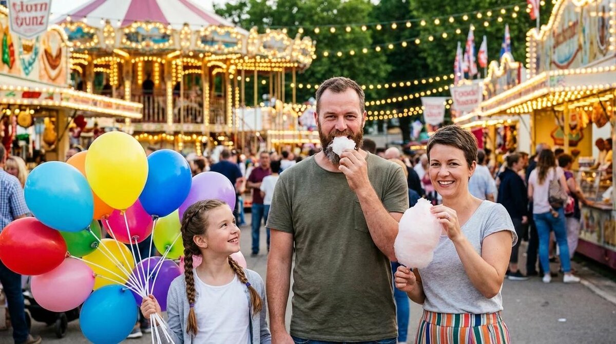 Сгенерировать фото🪄 Сохраните все характеристики лица, выражения, волосы, глаза с референсных фото в точности. Семья на традиционной ярмарке с каруселями и палатками. Дети с воздушными шарами, родители с сахарнойватой, праздничное освещение. Яркие цвета, весёлая атмосфера, народные гуляния. Репортажная фотография, живая энергия, культурное событие. Согласованность лиц, сохраняйте оригинальных людей.