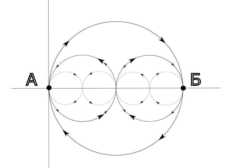 Точка А движется по окружности, внутри которой находится траектория точки Б - бесконечная "восьмерка".