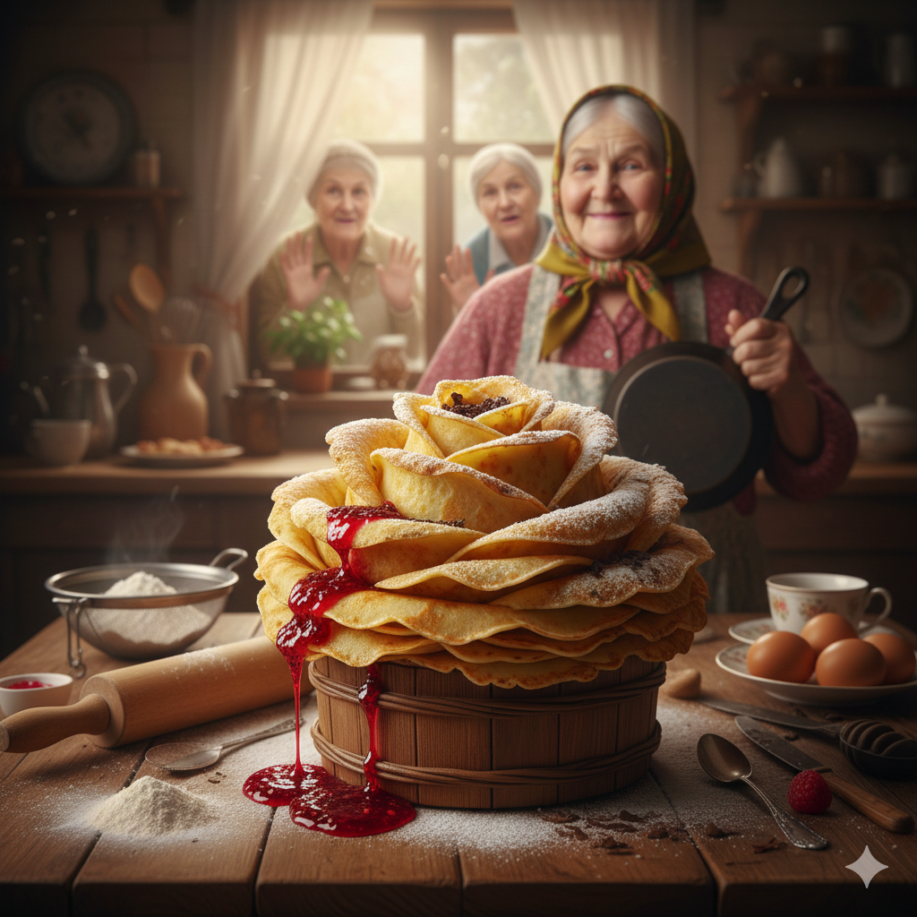 Ой, здравствуйте, мои ненаглядные, мои затейники! 👋 Сижу вот на табуреточке, солнышко в окошко светит, март на носу, а это что значит? Правильно — Масленица-красавица в дверь стучится! 🥞 Я вот на днях в кладовке порядок наводила, нашла старую чугунную сковородку (еще от мамы осталась, тяжелая — ух, ею только врагов от рассады отгонять! 🍳🛡️), и так мне захотелось чего-то этакого, изысканного, как в лучших домах Парижа или хотя бы в Хренландии в лучшие годы! 🌿 И вспомнила я про наш, родной, забытый шедевр — РОЗУ ИЗ БЛИНОВ! 🌹 Вы про нее, поди, и забыли за своими этими суши-драниками? А зря! Это же не просто еда, это же искусство, это же симфония теста и масла! 🎻🧈 Для начала, мои золотые, забудьте про магазинные смеси в пакетах! ❌ Это же сплошная химия, от нее только изжога да несварение. 🐳 Берем всё натуральное. И главное — добавьте щепотку любви и пол-ложечки соды, гашеной уксусом (это чтобы блинчики были с дырочками, как кружева на моей свадебной фате! 👰). Слушайте мой совет!