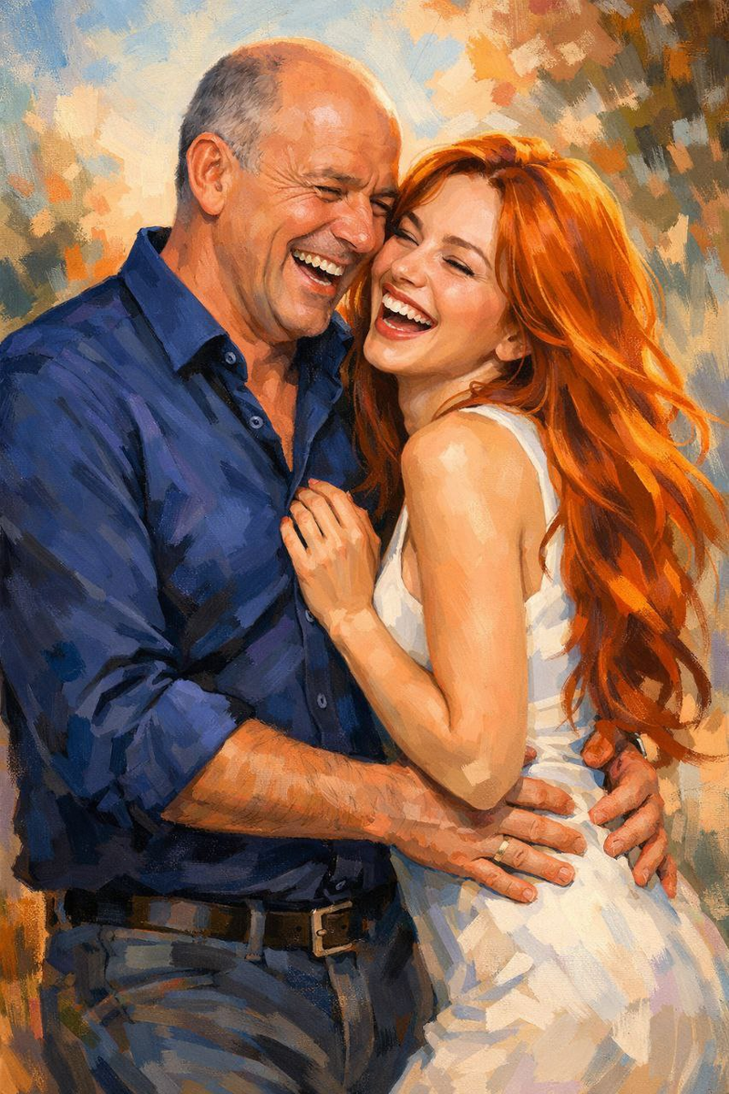Вика , её Викуся , смеялась — откинув голову, прижавшись к отцу плечом. Её рыжие волосы рассыпались по его тёмно-синей рубашке — той самой, приталенной. Он держал её за талию — не за руку, не вежливо под локоть, а именно за талию, уверенно, по-хозяйски, как держат только тех, кого считают своими — и наклонился к её уху, что-то говорил, и она снова смеялась.