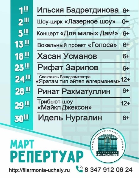 Репертуар на март — 2026г. 1.03 Ильсия Бадретдинова (6+) vk.com/wall-77320751_30965 2.03 Шоу-цирк «Лазерное шоу» (0+) https://clck.ru/3S48Q4 13.03 Вокальный проект «Голоса» (6+) https://clck.ru/3S48Q5 18.03 Хасан Усманов (6+) https://clck.ru/3S48Q7 23.03 Рифат Зарипов (6+) https://clck.ru/3S48Q8 24.03 «Яратам тип әйтеп өлгөрмәнем» (12+) https://clck.ru/3S48Q9 28.03 Ринат Рахматуллин (6+) https://clck.ru/3S48QB 29.03 Трибьют-шоу «Майкл Джексон» (12+) https://clck.ru/3S48QC 30.03 Идель Нургалин (6+) https://clck.ru/3S48QD Билеты в продаже в кассе филармонии Касса работает в будние дни с 10:00 до 19:00, перерыв 14:00-15:00 Телефон для справок 8 347 912-06-24 ___________________ В репертуаре возможны изменения, пост будет обновляться. Пожалуйста, о наличии билетов узнавайте по 8 347 912-06-24 Источник https://uchaly102.ru/?p=127117