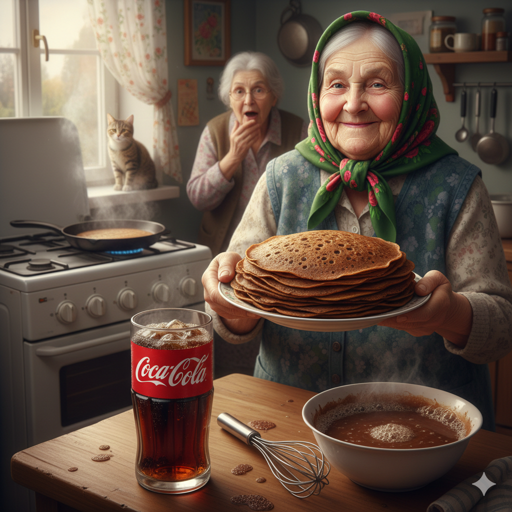 Ой, здравствуйте, мои драгоценные, мои любознательные! 👋 Сижу я, значит, на днях, листаю этот ваш «интернет» (внук научил на кнопки тыкать, теперь я как заправский хакер! 👩💻), и чуть со стула не рухнула! Пишут, что мир сошел с ума — теперь блины пекут не на молочке от коровки и не на кефирчике, а на... КОКА-КОЛЕ! 🥤💥 Вы представляете? Эта черная шипучка, которой мой зять болты на машине отмачивает (говорит, ржавчину ест лучше любого «Периметра» 🚢🛡️), теперь в наше святое масленичное тесто попала! Ну, я человек старой закалки, но любопытство-то сильнее меня. Решила: была не была, попробую этот «взрывной» рецепт, пока сковородка не остыла! 🍳✨ Взяла я, значит, бутылочку этой заморской воды. Цвет у неё, конечно, специфический — как будто кофе перемешали с дегтем из Хренландии 🌿, но пахнет сладенько. Рецепт-то, мои золотые, проще пареной репы, даже записывать особо нечего, но вы всё равно пометьте на полях газетки: Смешала я это всё... Мамочки мои! Оно как зашипит, как запузырится