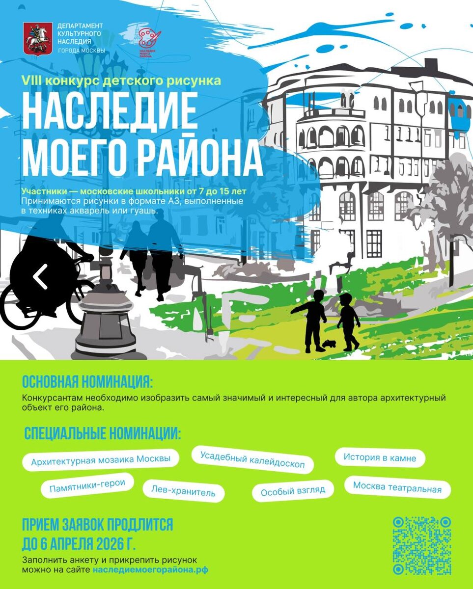 " Идет прием работ на участие в VIII конкурсе детского рисунка "Наследие моего района"! Подать заявку могут московские школьники в возрасте от 7 до 15 лет. Для этого необходимо заполнить электронную форму анкеты на сайте наследиемоегорайона.рф и прикрепить свой рисунок. Прием заявок продлится до 6 апреля 2026 г. (включительно). Рисунки можно присылать не только в основной номинации, но и в семи специальных номинациях: 🔹Особый взгляд 🔹Памятники-герои 🔹Усадебный калейдоскоп 🔹Москва театральная 🔹История в камне 🔹Архитектурная мозаика Москвы 🔹Лев-хранитель Победителей традиционно выбирают в двух возрастных группах: от 7 до 11 и от 12 до 15 лет в категориях "Любитель" (школьники, не занимающиеся дополнительно рисованием) и "Профессионал" (ребята, которые учатся рисовать). Принимаются рисунки в формате А3, выполненные в техниках акварель или гуашь, на которых изображен самый значимый и интересный для автора архитектурный объект его района: здание, храм, памятник, мост, беседка и т.