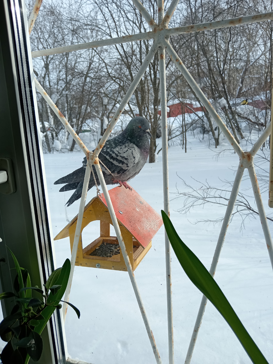 Мой любимый сизокрылый питомец тут как тут. Косит на меня оранжевым глазом. Запоминает. Лишь бы доволен был. А то голубиное недовольство может быть чревато неприятностями.